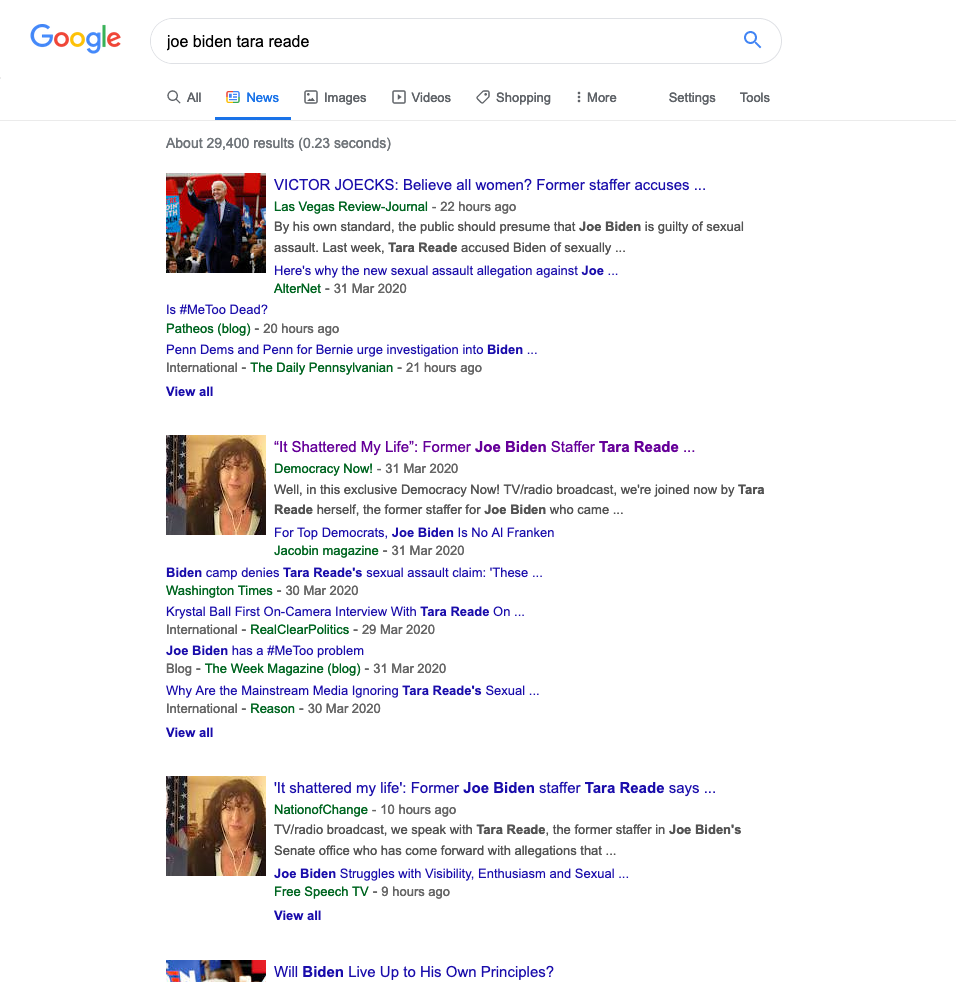Ukraine Joe has been accused of sexually molesting a staffer, Tara Reade, back in 1993. But despite #metoo, the mainstream media won’t touch the story. We have to wonder what’s going on. Is it because her story has no legs? Isn’t that we’ve always said about such claims? I thought the new standard was to always err on the side of taking claims such as these seriously?